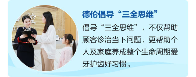 德伦口腔经历12年精耕,始终坚持匠心服务和精工品质,恪守“专业严谨、精益求精”的医疗准则,倡导“三全思维”准则,在口腔创新研发上步履不停,致力于让全民拥有一口健康好牙。